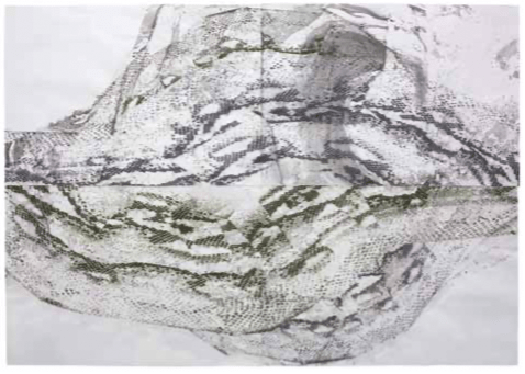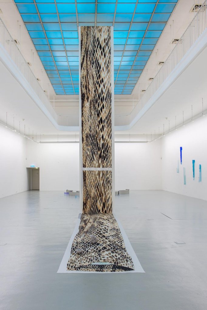 Alice Channer's work I find highly interesting and offers potential for how I may replicate my prints, in order to pick out areas of interest. Stretched Skin was made by photocopying sections of a snakeskin-print trouser leg. The resultant fragments were then reassembled, scanned and digitally manipulated, distorting and distending the pattern still further. I love the movement of process where the work is re-engaged by the body after the digital/mechanical steps, where the image is traced by hand in ink and graphite. I like that the physical is reproduced into something flat that allows for a totally different mode of display. I love the work below, where similar fabric has been printed on a large, stretched scale to produce something totally different. Something synthetic is appearing organic.