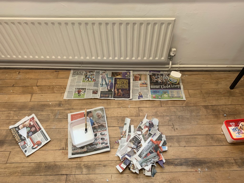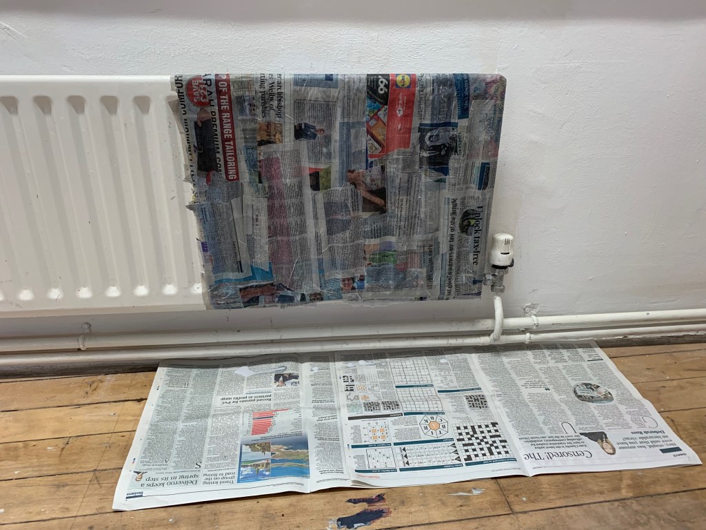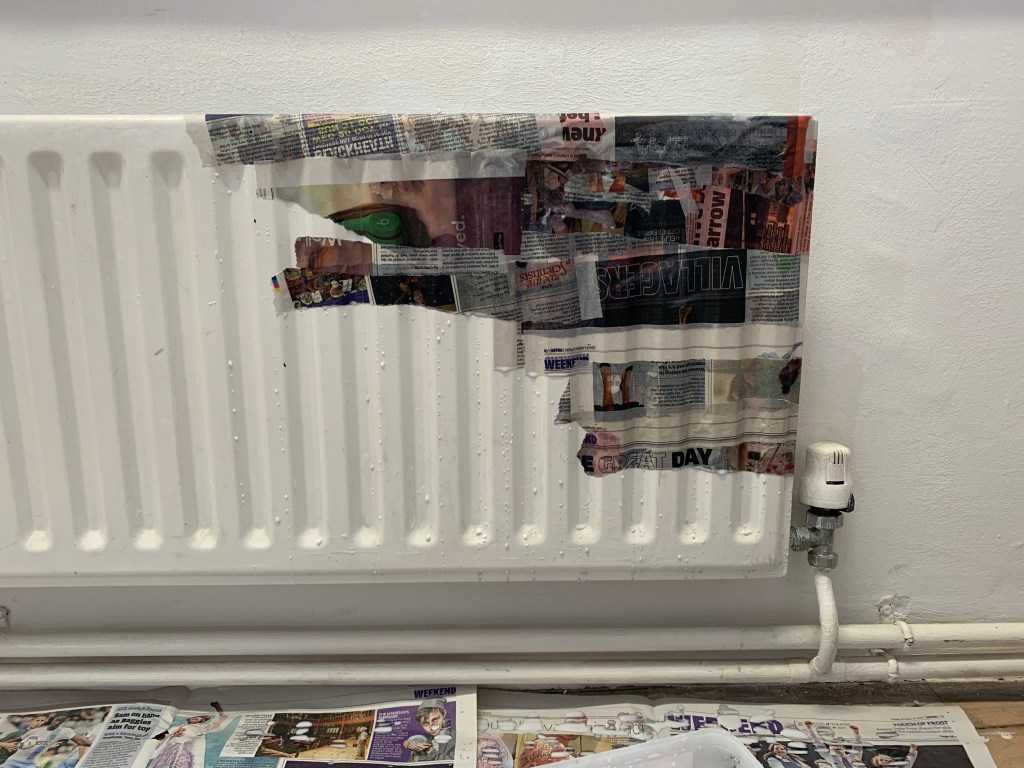 Applying papier-mâché to radiator Leaving papier-máché to dry