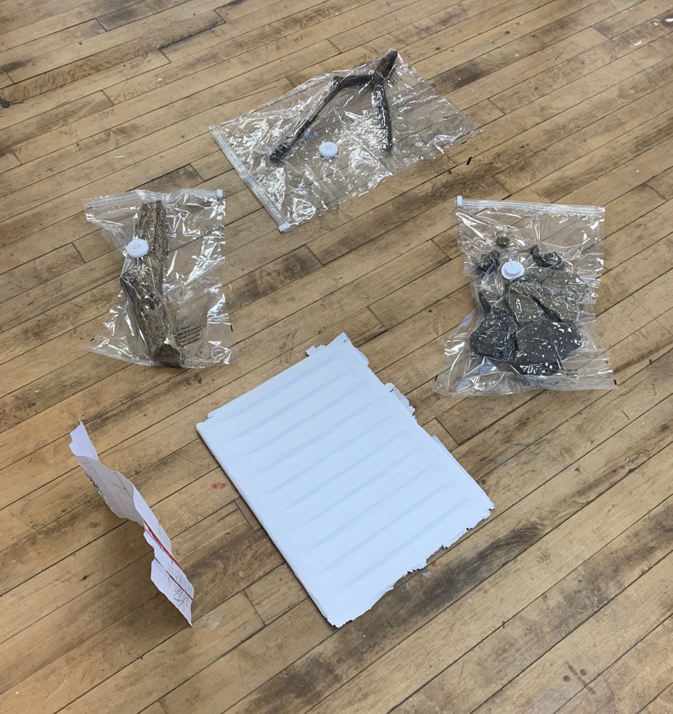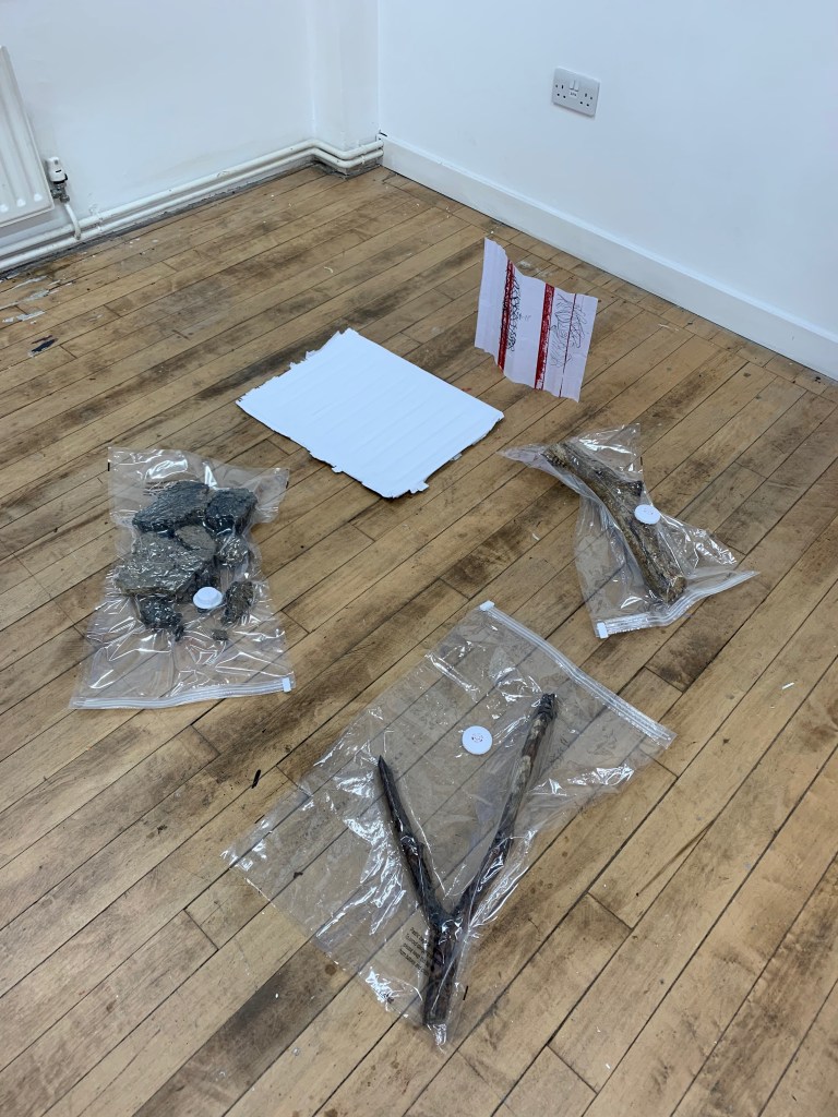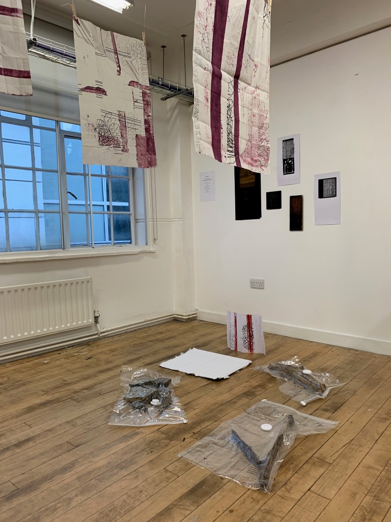 The opportunity to show my initial pieces of work for my silent critique was daunting and exciting at the same time. I took the opportunity to create a mini exhibition of my work so far. This allowed me to see how the work interacted with the studio space and made me consider titles for my work. Having the three display elements worked well together and allowed my peers to navigate and interact with the work as intended. I deliberately placed the titles for the work to the rear of the display to entice the viewers to walk through the exhibition and lead them to the works displayed on the wall. The prints I displayed on the wall were not presented as editions but exhibited in juxtaposition with the plates that made them. The plates are a work in their own right, with the largest plate being displayed without any prints relating to the object being shown.