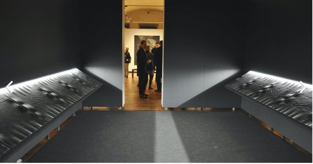 The work was installed in the purpose-built chapel-like space at the Rothko Centre. What I admired was that they were a series of inkless intaglio prints on hand-dyed black paper – could I make my own paper or paint a surface to print directly on? These were described as a series rather than an edition with each print being different, therefore, playing out like a story. The installation and lighting is an integral part of the work and does not just act as scaffolding, the work would not be able to exist without it. This provides me with ideas of how can make a black-on balck print and use light to trigger the work. The print would appear to the viewer once light lands on the surface. Raudos is Lithuanian and refers to songs that women would traditionally sing at someones burial. The display does have the feeling of a type of vessel in a place of contemplation, thus relating contextually to the work of Rothko where the work was installed. The below is a description by the artist’s son describing how the balck paper was made.