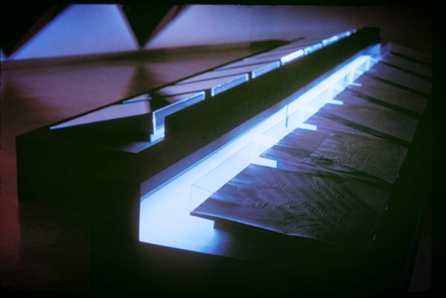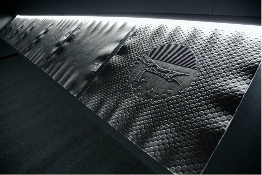 I love how the light can be seen across the material and appears bright, picking up the embossed print. I want to be able to fill a space with my prints and importantly, not have them displayed on the wall. I want to activate the space between the work and the viewer, where they can walk around and interact with the display.