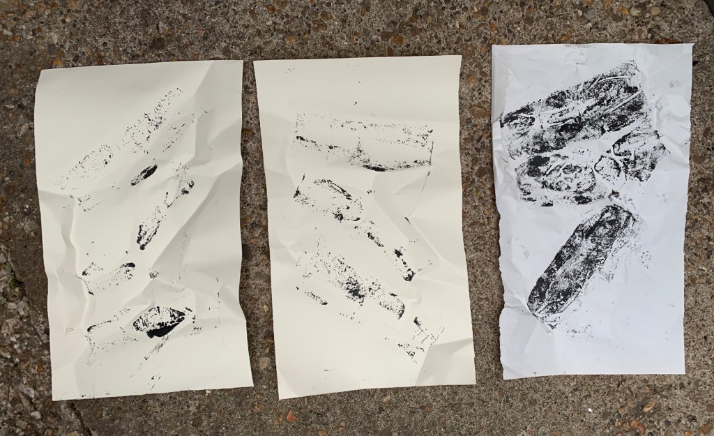 It was very difficult to get a perfect print without having excess ink all over the paper. This was due to the process of placing the paper and then inked branches into the bag. The first print could be managed but would require a clean bag, subsequent prints with the same bag would still have leftover ink on the plastic and would transfer to the paper. This process would lend itself to making one-off prints or would require a new bag or the bag being washed and dried in between prints.