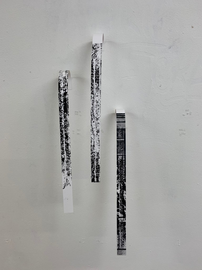 The above print fragments have developed naturally from my screen printing activity and the voids of space that manifest between the pixel. I placed sections of glossy paper to mask out sections when pulling my prints. The above leftover fragments dissolve and dissect the imagery; they become nothing, yet something and have no clear narrative. I like the ambiguity in them and offer many options to experiment positioning them throughout the studio space. They have a real tactile quality when running my fingers over them, they morph into a type of language, brail or an unknown dialect totem. More of the ink sits on the surface due to the glossy nature of the paper which adds to this quality.