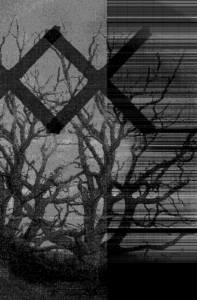 The above image which has been augmented from one of my tree drawings has gone through a three stage process of digital manipulation; the image was uploaded into Photoshop where it was translated into a bitmap image. The parameters were changed numerous times to achieve the grid-like structures in the image. The file was then taken into PhotoscapeX, another digital editing programme to further manipulate the image. After this process, the image was uploaded into Photoshop to grayscale the image and further adjust the bitmap code. Once this was complete, the image was printed on trace in preparation for the screen making processes. This will then be used for my continuous print on lining paper and used to print on canvas. The continuous roll is developed in response to my interactions with the printer/photocopier and the canvas print is inspired by the previous fragmented screen prints where the print was taken over four sheets of paper.